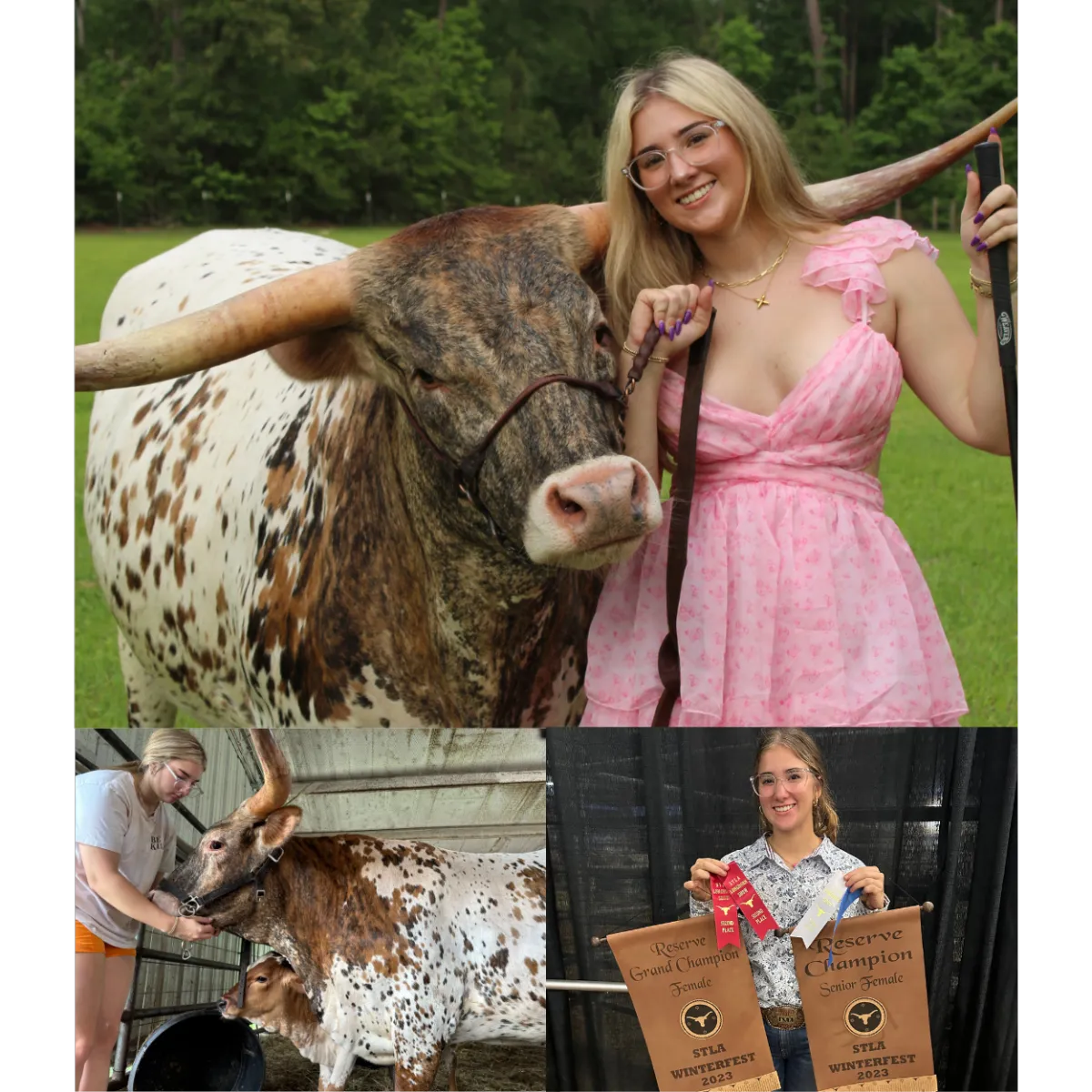 Annabel has been raising and showing cattle since her sophomore year at Oak Ridge High School. Through her FFA journey, she’s developed not only a passion for livestock, but also a commitment to excellence, responsibility, and growth. Miss Texas Tuff was Annabel's first project. Blessed to have been given the opportunity from Tonie with Wild Peach Longhorns. Annabel and Miss Texas had a bond from day one. They went on to win many awards during their time together. She raised her to be a momma and helped birth her first calf "Texas Blue Bonnet" aka "Blu" May 1st of 2025.